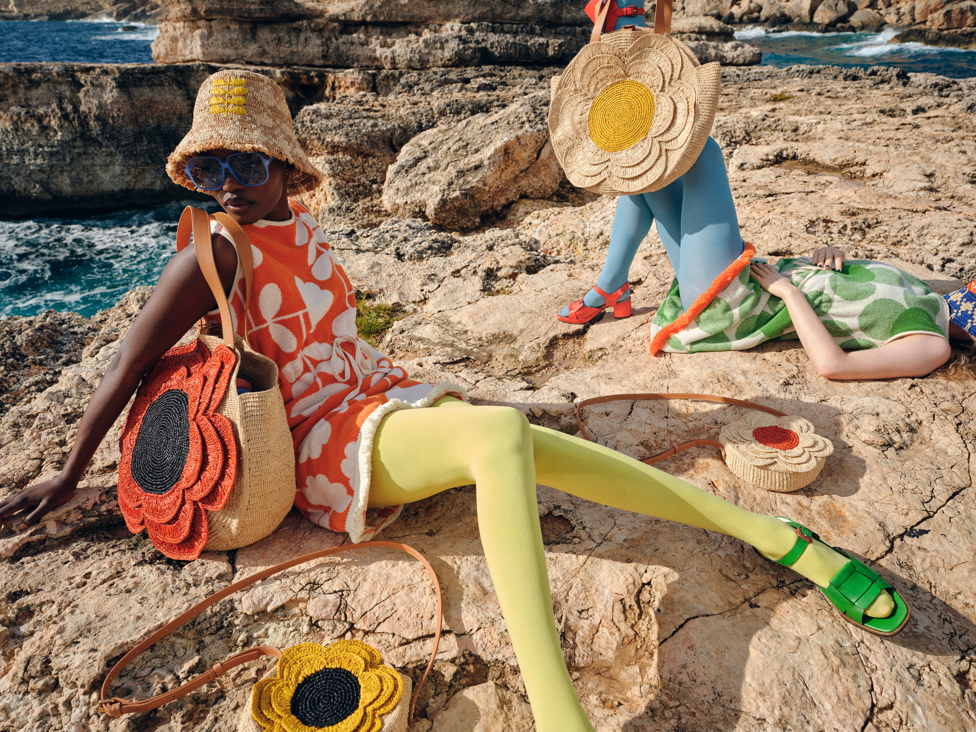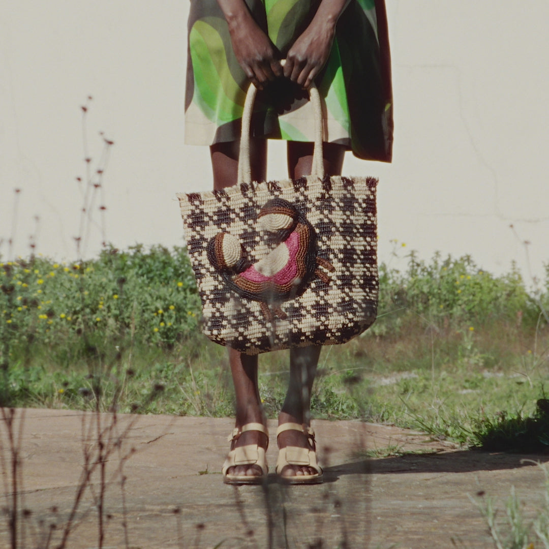 Crab and Houndstooth Raffia Tote Bag - Monochrome