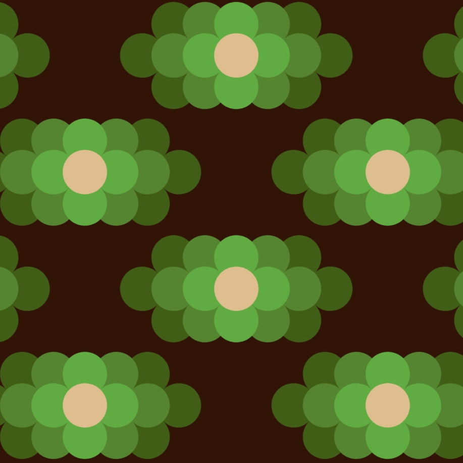 Flower Haze Neon Green is a bold and playful floral print with a fresh, retro feel. Clusters of rounded green petals sit in neat rows, each with a soft beige centre, set against a deep brown background. The mix of bright and muted greens gives it a fun pop of colour while keeping it stylish and wearable. With its mix of mid-century charm and modern energy, this print is perfect for adding a splash of personality to your outfit.